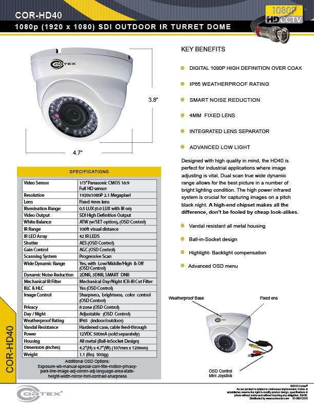 Designed with aesthetics in mind, the HD40 is produced for industrial applications where image adjusting is vital. The external / removable OSD joystick with test monitor output is ideal for demanding applications.