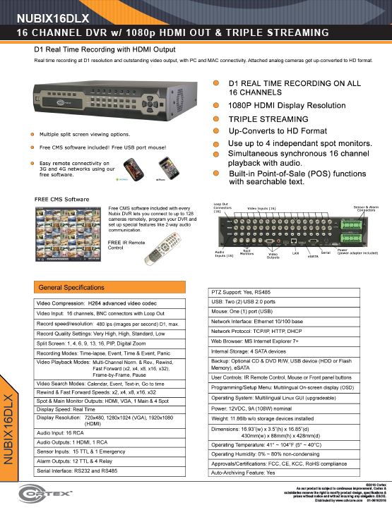 The 16-channel Nubix 16DLX is a professional security DVR that provides simultaneous Real Time recording on all channels at an extraordinary D1 resolution. It also provide an HDMI output stream. Since this DVR also converts attached cameras to HD resolution, it's a great upgrade. It can make old cameras look great.